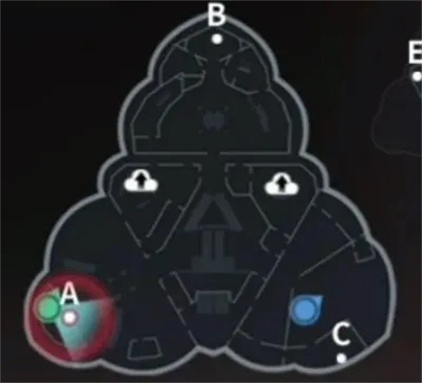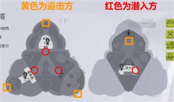 游戏开局双方都有4个可选择出生点,图片中黄色为追击方选择区域出生点,红色为潜入方选择区域出生点。