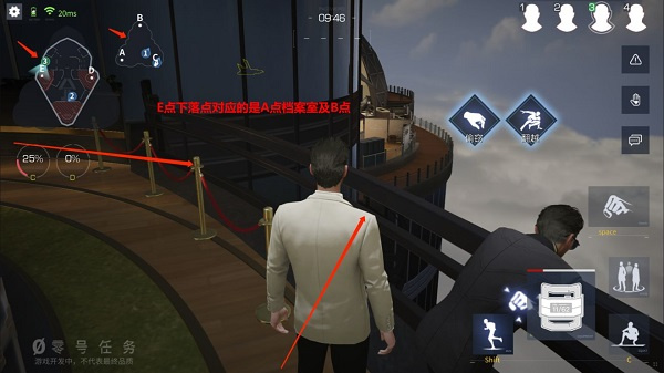 1楼A点看向二楼E点窗户走廊,明显有2个下落点,分别对应着E点1号下落点的楼梯管理处和E点2号下落点的厨房管理处。同时请注意左侧小地图划线处(这里经常是潜入方和追击方的纠缠点),队友倒地可通过这些落地点进行救援。