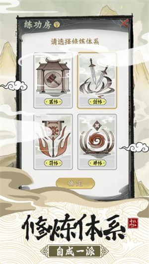 2、制定体系 — 剑修、器修、丹修、符修等多个修炼体系等你选择,由一宗之主的你来制定门下的修炼风格。