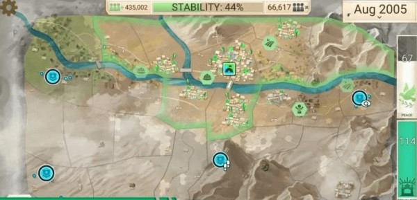 进入游戏之后,你的军队需要驻扎在当地并且不断壮大实力,操作菜单分为概览、平民、政府和军队四个选择,你需要获得资金保证政府运作,修建水电、医疗、交通、通讯等基础设施提高经济发展水平和当地人支持率,同时要预防腐败以免祸起萧墙。