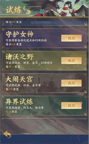 刚开始时试炼挑战会开放4个玩法,分别是守护女神、诸沃之野,大闹天宫,异界试炼、祖龙秘境。