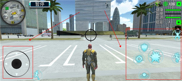 3、然后我们返回游戏界面,左边的摇杆是控制方向的,而右边则是我们的各种技能